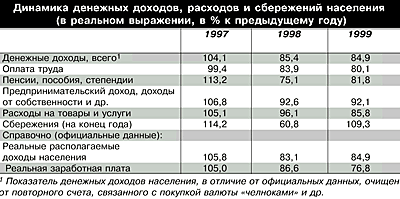 Источник: Госкомстат РФ, АЛ "Веди" Наиболее вероятно, что в нынешнем году тенденция к восстановлению доходов населения найдет продолжение. А в рамках данной тенденции будет происходить и восстановление уровня потребления населения - следовательно, весьма вероятным представляется также рост частного потребления и розничного товарооборота. В прошедшем году 79.8% всех доходов населения было направлено на покупку товаров и оплату услуг (в 1998 г. - 78.3%), Согласно уточненному прогнозу Министерства экономики РФ, в 2000 г. рост реальных располагаемых доходов населения составит 2-4%, а розничного товарооборота - 2%. Таким образом, официальный сценарий предполагает, что увеличение реальных доходов населения будет направлено на восстановление уровня потребления. Остатки банковских депозитных вкладов физических лиц возросли за прошлый год на 36%, т.е. остались фактически неизменными в реальном выражении относительно предшествующего года (рост потребительских цен составил 36.5%). Основной прирост банковских частных вкладов был отмечен в Сбербанке РФ - главным образом за счет пенсионных и срочных пенсионных вкладов. В остальных коммерческих банках депозиты населения остались фактически неизменными в номинальном выражении. Объем реальных сбережений населения в 2000 г., скорее всего, сохранится на уровне прошлого года. Направления же сбережений будут определяться уровнем политической стабильности и уровнем реформирования в финансовой сфере. В случае сохранения кризиса банковской системы и неблагополучного состояния финансовых рынков значительная часть сбережений будет направлена на покупку иностранной валюты. Депозиты населения в реальном исчислении останутся неизменными, т.е. номинально возрастут на 18-25%. Ситуация может измениться в случае проведения коммерческими банками агрессивной политики процентных ставок (реальные процентные ставки по депозитам населения превысят 15-25%). Однако и тогда существенного роста депозитов населения не произойдет, и в реальном выражении они могут увеличиться на 5-10%. Заключение. Велико значение обобщающих статистических показателей в решении важнейших проблем при рассмотрении демографической политики. Они необходимы для определения роста населения, в изучении миграции населения, составляющей основу межрайонного перераспределения рабочей силы и достижения равномерности ее распределения. Поскольку население в определенном аспекте изучают многие другие науки – здравоохранение, педагогика, социология и пр., необходимо использовать опыт этих наук, развивать их методы применительно к нуждам статистики. Стоящие перед нашей страной задачи обновления должны затронуть и решение демографических проблем. Разработка комплексных программ экономического и социального развития должна включать в себя разделы по демографическим программам. Их решение должно способствовать развитию населения с наименьшими демографическими потерями. Список литературы Андреева Б.М., Вишневский А.Г. Продолжительность жизни. Анализ и моделирование, М.: «Статистика», 1979. Бедный М.С. Мальчики или девочки? Медико - демографический анализ, М.: «Статистика», 1980. Боярский А.Я., Громыко Г.Л. Общая теория статистики, М.: «Московские университеты», 1985. Бестужев-Лада И.В. Мир нашего завтра, М.: «Мысль», 1986. Кильдишев и др. Статистика населения 