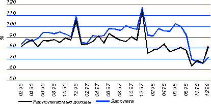 Реальный размер средней заработной платы (начисленной) в 1998 г. уменьшился по сравнению с уровнем 1997 г. на 13.8%, среднемесячная начисленная заработная плата составила 1095 млрд. руб. Просроченная задолженность по заработной плате на 1 января 1999 г. равнялась 77.0 млрд. руб. (из нее задолженность из-за отсутствия финансирования из бюджетов всех уровней - 19.7 млрд. руб.); однако за декабрь 1998 г. задолженность сократилась на 8.0 млрд. руб. (на 2.4 млрд. руб.). Реальный размер назначенной пенсии в 1998 г. снизился на 4.8% по сравнению с аналогичным показателем в1997 г. 8.2. Итоги 1999 года и прогноз на 2000 год. Прогнозные оценки состояния доходов и расходов населения на 1999 г. были достаточно стабильными и менялись в течение года незначительно. Основными факторами, определявшими динамику доходов населения, были следующие. Во-первых, то, насколько предприятия, получившие преимущества от девальвации, будут восстанавливать уровень заработной платы, резко сократившийся после финансового кризиса. Во-вторых, насколько активно в рамках принятого бюджета будут происходить индексация заработной платы и погашение задолженности по социальным платежам. Напомним, что средняя начисленная заработная плата в промышленности сократилась после кризиса в три раза в пересчете на иностранную валюту. Соответственно, и заработная плата работникам бюджетной сферы, несмотря на частичное погашение задолженности, существенно снизилась в реальном исчислении. Оказалось, что восстановление доходов населения происходило в 1999 г. гораздо более низкими темами, чем это предполагалось в прогнозных расчетах. Однако во втором полугодии данный процесс приобрел устойчивую динамику. Динамика начисленной заработной платы (в промышленности) и начисленных пенсий