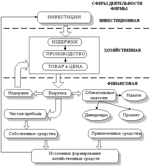 Структура бизнеса как системы. На рис. 1 приведена структура бизнеса как закрытой системы, внутри которой происходит взаимодействие решений в инвестиционной, хозяйственной и финансовой сферах деятельности фирмы, а также осуществляется расширенное воспроизводство инвестируемых ресурсов.