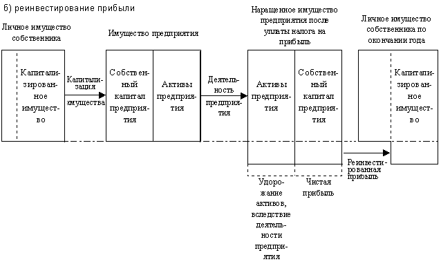 Рисунок 1.1.1 Изменение имущественного состояния предприятия и собственников Как видно из схемы, богатство собственника увеличивается в любом случае. Однако при получении дивидендов он увеличивает ту часть своего личного имущества, которая находится в его непосредственном распоряжении и может быть использована для личного потребления. В другом случае увеличивается отчужденная часть его имущества, вложенная в собственный капитал предприятия. Однако подобное отчуждение не означает полную утрату собственности на это имущество. При необходимости владелец может продать свою долю в собственном капитале предприятия (например, акции) и получить взамен деньги, которые может использовать по своему усмотрению С момента своего создания предприятие получает значительную независимость от своих владельцев, которых в принципе не интересуют способы, которыми руководство предприятия собирается увеличивать стоимость капитала, полученного в свое распоряжение. В соответствии со схемами, изображенными на рис. 1.1.1, имущественное состояние предприятия в момент его создания можно изобразить следующим образом (рис. 1.1.2).