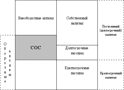 Рисунок 1.1.4. Схема основного балансового уравнения В практике отечественного бухгалтерского учета принято называть всю правую часть балансового уравнения (СК + П) пассивом, рассматривая ее как единое целое. Формально никакой разницы при этом не возникает. Однако с финансовой точки зрения собственный капитал имеет совершенно иную природу и принципиально отличается от заемных источников. Владельцы становятся богаче, если увеличивается собственный капитал предприятия. С ростом заемного капитала увеличивается общая сумма активов предприятия. Однако само по себе это увеличение еще не означает обогащения собственников предприятия, так как активы, приобретаемые за счет заемных средств, “обременены” обязательствами, величина которых равна сумме вновь приобретенных активов. В будущем, если предприятие сумеет воспользоваться эффектом финансового рычага и новые активы принесут дополнительный доход, владельцы смогут ощутить увеличение стоимости своей доли в активах предприятия. Разница между общей стоимостью активов и общей величиной заемного капитала называется чистыми активами. Из основного балансового уравнения следует, что чистые активы должны равняться величине собственного капитала предприятия. На практике это равенство как правило не соблюдается: официальной методикой расчета величины чистых активов акционерных обществ предусмотрено исключение из итога актива некоторых статей (например, суммы НДС по приобретенным ценностям, задолженности учредителей по взносам в уставный капитал и др.). Величина пассивов также корректируется – в частности, к ней добавляется сумма целевого безвозмездного финансирования, полученного предприятием. Поэтому рассчитанные таким образом чистые активы обычно бывают меньше общей величины собственного капитала. Если размер чистых активов опустится ниже уровня уставного капитала (у действующего предприятия уставный капитал это только часть собственного капитала), то акционерное общество должно перерегистрировать свой устав, доведя в нем размер уставного капитала до величины чистых активов. Несколько видоизменив схему, представленную на рис. 1.1.4, можно наглядно представить методику формирования еще одного важнейшего финансового показателя – наличие собственных оборотных средств (СОС) или величина собственного оборотного капитала (синоним – чистый оборотный капитал) (рис. 1.1.5).