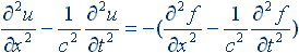 Мы можем выбрать и присвоить функции f определенное выражение. Пусть, например, f = (cosπx·sinat)4 , когда –1 < x < 1 и 0 < t < π/a; f = 0 если x < –1 или x > 1 и t > π/a или t < 0. Функция ограничена f в пространстве и во времени. В этом случае уравнение (3) превращается в неоднородное волновое уравнение, правая часть которого нам известна. Теперь мы можем сформулировать начальные условия для функции u. Начальные условия: