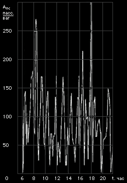 Эти цифры показывают, что скорость, с которой пассажир метрополитена сможет передвигаться по городу в недалеком будущем, составит (в среднем) около 25 км/ч. Поскольку сегодня средняя скорость передвижения по городу на метро составляет 22 км/ч, то можно сказать, что сегодняшний метрополитен реализует свои предельные (с точки зрения скорости передвижения пассажира по городу) возможности на 90%. Это очень высокий показатель. И он был достигнут уже в прошлом веке. Провозная способность метрополитена ограничена пропускной способностью его подземных станций. Пропускная способность станций тесно связана со скоростью сообщения. При росте скоростей сообщения возрастают скорости движения метропоездов по перегонам. Как следствие, возрастают скорости начала торможения метропоездов, а значит и тормозные пути. Поэтому с целью обеспечения безопасности движения увеличивают расстояние между идущими друг за другом метропоездами. Здесь полная аналогия с автодорогой: чем больше скорость движения автомобилей, тем большими должны быть безопасные расстояния между ними. Повышение скорости движения не способно скомпенсировать увеличение расстояний между метропоездами с точки зрения частоты следования метропоездов. В результате при росте скоростей движения частота следования метропоездов уменьшается, пропускная способность станций и провозная способность линий метрополитена сокращаются. Во многом и по этой причине, стремиться повышать скорость сообщения метропоездов между подземными станциями сверх 48—50 км/ч практически нецелесообразно. Провозная способность линий метрополитена определяется пропускной способностью станций и наполнением вагонов следующих друг за другом метропоездов. На Рис. 1 представлен график нагрузки одного из вагонов семивагонного метропоезда при его работе в течение суток на самом напряженном маршруте наиболее загруженной линии Московского метрополитена.