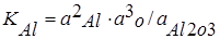 где аAl – активность алюминия в стали аAl2O3 – активность глинозема в образующейся шлаковой фазе КAl · aAl2O3 = K’Al (19) Константа K’Al приближенно определена и равна: - для шамотной футеровки K’Al = 10-12; - для высокоглиноземистой футеровки K’Al = 10-13 Допуская, что аAl ≈ [Al] = 0,025, получим выражение для определения аО