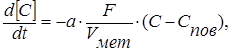 где α – коэффициент скорости массопереноса растворенного вещества, см/с; F – площадь поверхности раздела газ-металл; Vмет – объем металла; (С-Спов) – градиент концентрации, в случае десорбции измеряемый разностью между средней концентрацией растворенного вещества в объеме жидкости и на ее поверхности. После интегрирования получим: