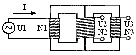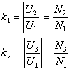 где М - взаимная индуктивность второго и первого контуров. М зависит от взаимного расположения контуров , геометрической формы и размеров контуров, а кроме того от магнитной проницаемости среды, в которой находятся контуры. При холостом ходе трансформатора, когда ток во вторичной обмотке отсутствует (l2,3= 0 ), отношение абсолютных значений напряжений на концах вторичных и первичной обмоток называется коэффициентом трансформации k.