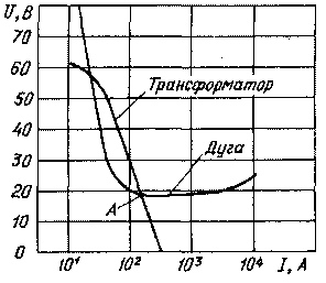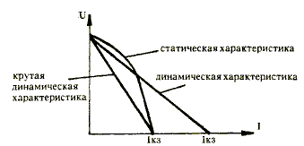 Рис. 3. Динамическая и статическая характеристики сварочного аппарата. При крутой динамической характеристике источника питания динамические токи КЗ значительно меньше (они близки к статическим токам КЗ) и при удлинившейся дуге образуется стабильная рабочая точка. Вышеперечисленным требованиям в полной мере соответствует источник напряжения, выполненный по схеме генератора тока. Свойства такой конструкции в полной мере подходят и для зарядного устройства. На рис. 4 показана типичная статическая ВАХ электрической дуги. При наложении на нее выходной ВАХ сварочного трансформатора легко видеть, что устойчивой точкой поддержания дуги является точка А, причем увеличение крутизны "падения" характеристики сварочного трансформатора приводит к еще большей стабилизации дуги.