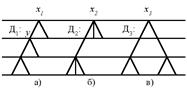 Рис. 1 Рассмотрим специальный класс отношений строгого порядка - так называемые древесные порядки. Пусть имеется множество M с отношением строгого порядка . Элемент x0 называется наибольшим, если для всякого у M, отличного от x0, выполнено соотношение уx0. Очевидно, что наибольший элемент, если он существует, единствен. Определение 5. Отношение строгого порядка на множестве M называется отношением древесного порядка (или древесным порядком), если 1) из того, что xу и xz следует, что у и z сравнимы; 2) во множестве М, , существует наибольший элемент. Множество M с заданным на нем древесным порядком называют деревом, а наибольший элемент - корнем дерева. Для конечного дерева существует числовая характеристика - сложность дерева, которую будем отождествлять со сложностью решения задачи. На рис.2 изображены деревья, имеющие одинаковое число вершин, и показан способ нахождения сложности дерева ((Дi)).