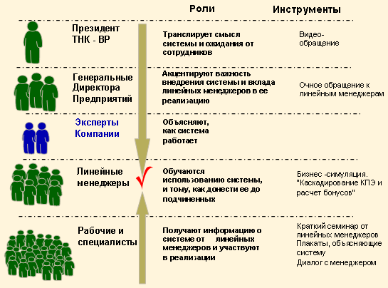 Исходя из понимания ключевой роли линейных менеджеров в реализации новой системы, все инструменты внедрения были объединены в формат однодневной обучающей конференции для линейных менеджеров, с количеством участников от 70-ти до 120-ти человек. Конференции прошли в каждом регионе присутствия компании. Конференция состояла из 5-ти ключевых блоков: 1. Идеологический блок. Включал в себя видео-обращение Президента компании ТНК-ВР Роберта Дадли, в котором он рассказывал о смысле и задачах новой системы, роли менеджмента и сотрудников в ее внедрении, а так же очное вступительное слово Генерального директора предприятия, посвященное конкретным ожиданиям к менеджерам – участникам конференций по отношению к задаче внедрения новой системы. В результате линейные менеджеры понимали важность, цель внедрения и свою роль в этом процессе. 2. Теоретический блок. Включал в себя презентацию экспертов компании, подробно объясняющую содержание новой системы, а так же ответы на вопросы менеджеров – участников конференций относительно новой системы. В результате у линейных менеджеров формировалось содержательное понимание новой системы. 3. Работа с сопротивлением. Проходила в формате деловой игры «Скептики и оптимисты», в ходе которой у участников конференции была возможность оспорить новую систему, высказать вслух причины, по которым она может не сработать и получить ответы на свои сомнения. В результате сопротивление внедрению новой системы было существенно снижено. 4. Научить делать. Проходил в формате бизнес-симуляции, моделирующей процесс формирования показателей и расчета бонуса на материале реальной работы участников. Здесь было все как в жизни: руководители получают цели предприятия (очень близкие к реальным), на их основе формулируют показатели для подчиненного, проводят беседу, моделирующую процесс согласования показателей и рассчитывают бонус подчиненного по итогам года. Такая форма работы на конференции (моделирование реальности) помогла шаг за шагом «прожить» новый процесс, который руководителю только предстоит реализовать, и дала практический навык – как именно внедрять систему по отношению к своим подчиненным. 5. Помочь правильно донести до подчиненных. Этот этап включал в себя тренировочную беседу по проведению встречи с подчиненным. Также каждый участник конференции получил подробные материалы по новой системе, включая сценарий мини-семинара для подчиненных, который в дальнейшем руководители повели сами по отношению к своим сотрудникам. Для сотрудников были отпечатаны плакаты, простым и понятным языком объясняющие цели и содержание вводимой системы. В результате, руководители были подготовлены к тому, чтобы правильно донести систему до подчиненных. Результаты проекта (Март 2006 года). По данным опроса, поведенного среди участников обучающих конференций, более 90% участников сказали, что после конференции им стал понятен подход (конкретная технология формирования ключевых показателей и расчета годового бонуса) и ясна собственная роль в процессе внедрения системы. На сегодняшний день новая система успешно работает практически на всех предприятиях компании. |