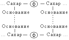 Символ Ф обозначает фосфатную группу. Чередующиеся остатки сахара и фосфорной кислоты образуют сахарофосфатный остов молекулы, одинаковый у всех ДНК, а огромное их разнообразие обусловливается тем, что четыре азотистых основания могут располагаться вдоль цепи в самой разной последовательности. Сахаром в нуклеиновых кислотах является пентоза; четыре из пяти ее углеродных атомов вместе с одним атомом кислорода образуют кольцо. Атомы углерода пентозы обозначают номерами от 1 до 5. В РНК сахар представлен рибозой, а в ДНК дезоксирибозой, содержащей на один атом кислорода меньше. Фрагменты полинуклеотидных цепей ДНК и РНК показаны на рисунке. Поскольку фосфатные группы присоединены к сахару асимметрично, в положениях 3 и 5, молекула нуклеиновой кислоты имеет определенное направление. Сложноэфирные связи между мономерными единицами нуклеиновых кислот чувствительны к гидролитическому расщеплению (ферментативному или химическому), которое приводит к высвобождению отдельных компонентов в виде небольших молекул. Азотистые основания – это плоские гетероциклические соединения. Они присоединены к пентозному кольцу по положению 1. Более крупные основания имеют два кольца и называются пуринами: это аденин (А) и гуанин (Г). Основания, меньшие по размерам, имеют одно кольцо и называются пиримидинами: это цитозин (Ц), тимин (Т) и урацил (У). В ДНК входят основания А, Г, Т и Ц, в РНК вместо Т присутствует У. Последний отличается от тимина тем, что у него отсутствует метильная группа (CH3). Урацил встречается в ДНК некоторых вирусов, где он выполняет ту же функцию, что и тимин. Трехмерная структура. Важной особенностью нуклеиновых кислот является регулярность пространственного расположения составляющих их атомов, установленная рентгеноструктурным методом. Молекула ДНК состоит из двух противоположно направленных цепей (иногда содержащих миллионы нуклеотидов), удерживаемых вместе водородными связями между основаниями: