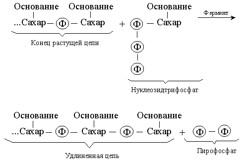 Соответствие АТ и ГЦ называют правилом комплементарности, а сами цепи комплементарными. Согласно этому правилу, содержание аденина в ДНК всегда равно содержанию тимина, а количество гуанина – количеству цитозина. Следует отметить, что две цепи ДНК, различаясь химически, несут одинаковую информацию, поскольку вследствие комплементарности одна цепь однозначно задает другую. Структура РНК менее упорядочена. Обычно это одноцепочечная молекула, хотя РНК некоторых вирусов состоит из двух цепей. Но даже такая РНК более гибка, чем ДНК. Некоторые участки в молекуле РНК взаимно комплементарны и при изгибании цепи спариваются, образуя двухцепочечные структуры (шпильки). В первую очередь это относится к транспортным РНК (тРНК). Некоторые основания в тРНК подвергаются модификации уже после синтеза молекулы. Например, иногда происходит присоединение к ним метильных групп. Одна из основных функций нуклеиновых кислот состоит в детерминации синтеза белков. Информация о структуре белков, закодированная в нуклеотидной последовательности ДНК, должна передаваться от одного поколения к другому, и поэтому необходимо ее безошибочное копирование, т.е. синтез точно такой же же молекулы ДНК (репликация). Репликация и транскрипция. С химической точки зрения синтез нуклеиновой кислоты – это полимеризация, т.е. последовательное присоединение строительных блоков. Такими блоками служат нуклеозидтрифосфаты; реакцию можно представить следующим образом: