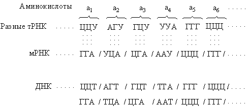 Вообще говоря, каждой аминокислоте соответствует более одного кодона. Большинство кодонов, кодирующих одну и ту же аминокислоту, имеют два одинаковых первых основания, но в трех случаях (для лейцина, серина и аргинина) имеются два альтернативных набора первых дублетов в кодонах, соответствующих одной и той же аминокислоте. Природа основания в третьем положении не столь важна; одна и та же аминокислота глицин может кодироваться по-разному: ГГУ, ГГЦ, ГГА и ГГГ. Однако кодоны для двух разных аминокислот могут иметь два одинаковых первых основания, и тогда различие между ними будет определяться природой третьего основания – пурином или пиримидином. Так, гистидин кодируется триплетами ЦАУ и ЦАЦ, а глутамин ЦАА и ЦАГ. Три кодона, УАА, УАГ и УГА, не кодируют никаких аминокислот и называются «бессмысленными». Одна молекула ДНК кодирует много белковых цепей. Каждый отрезок, кодирующий одну цепь, называют цистроном. Начало и конец цистрона, а также граница раздела между ними помечаются с помощью своего рода знаков химической пунктуации. По крайней мере у бактерий в начале цистрона находится метиониновый кодон АУГ. Логично предположить, что первой аминокислотой в белке всегда должен быть метионин, но часто несколько первых аминокислот отщепляются ферментативно после окончания синтеза белка. Конец белковой цепи помечается одним или несколькими «бессмысленными» кодонами. У бактерий (прокариот) практически вся ДНК кодирует какие-либо белки или тРНК. Однако у высших форм (эукариот) значительная часть ДНК состоит из простых повторяющихся последовательностей и «молчащих» генов, которые не транскрибируются в РНК и поэтому не транслируются в белки. Кроме того, исходно синтезированная мРНК содержит участки, не детерминирующие никаких белковых последовательностей. Такие участки (интроны), расположенные между кодирующими участками (экзонами), перед началом синтеза белка удаляются специальными ферментами. Почему в ДНК существуют эти казалось бы бесполезные сегменты – неясно; возможно, они выполняют регуляторные функции. У простейшей Tetrahymena РНК сама удаляет свои интроны и соединяет свободные концы цепей, действуя как фермент по отношению к себе самой. Это единственное известное исключение из правила, согласно которому нуклеиновые кислоты не обладают ферментативной активностью. Транспортные РНК и супрессия. Смысл информации, содержащейся в ДНК, если переводить ее на язык аминокислот, определяется как самой ДНК, так и считывающим механизмом, т.е. зависит не только от того, какие кодоны есть в ДНК и в какой последовательности они расположены, но также и от того, какие именно аминокислоты (и к каким тРНК) присоединяют аминоацил-тРНК-синтетазы. Конечно, природа синтетаз и тРНК тоже определяется ДНК, и в этом смысле ДНК является первичным детерминантом белковой последовательности. Тем не менее суммарная детерминация представляет собой функцию всей системы, поскольку результат зависит от исходных компонентов. Если бы соответствие между тРНК и аминокислотами было другим, смысл кодонов тоже изменился бы. Известно, что мутации в ДНК изменяют считывающий механизм и в результате меняют – пусть и незначительно – смысл кодонов. Так, в бактерии Escherichia coli глициновая тРНК обычно узнает в мРНК кодон ГГА; мутация в ДНК, с которой транскрибируется эта 