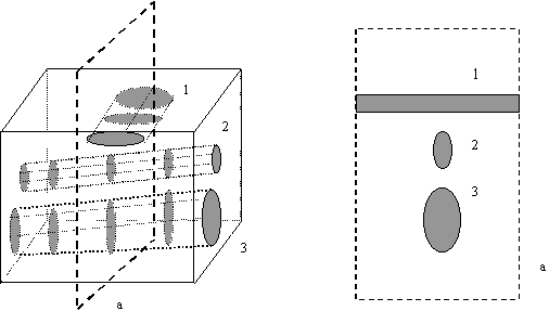 Рис. 3. Для определения осредненной проницаемости по одному из направлений Ох, Оу или Оz выбираются те трубки тока, которые пересекают выбранное тело в заданном направлении. В данном случае для нахождения компоненты тензора проницаемости Кх используются песчаные тела 2 и 3, а для компоненты Ку - тело 1 (рис. 3). Считаем, что все трубки тока идут параллельно граням параллелепипеда. Для вычисления значения Кх всем геологическим ячейкам, не входящим в выделенные тела 2 и 3, припишем фиктивную нулевую проницаемость, так как эти ячейки не участвуют в определении осредненной проницаемости в направлении оси координат Ох. Тогда, согласно закону Дарси в сеточном виде: