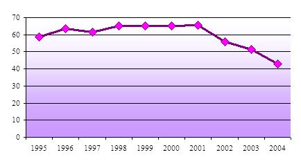 Рис. 6. Общая раскрываемость преступлений в г. Уссурийске (%) УВД г. Уссурийска по-прежнему уделяет внимание вопросам профессиональной подготовки и самоподготовки личного состава, в том числе по действиям в чрезвычайных обстоятельствах. Были проведены ТСУ с привлечением личного состава ОВД Уссурийской оперативной зоны по пресечению захвата важных объектов, КШУ по ликвидации бандформирований, КШУ по пресечению захвата важных объектов и массовых беспорядков в населенном пункте, тренировки личного состава УВД г. Уссурийска по розыску и задержанию вооруженных и иных особо опасных преступников, освобождению заложников. В течение 2004 года подразделениями УВД г. Уссурийска был проведен ряд организационных и практических мероприятий, направленных на активизацию работы по формированию положительного общественного мнения посредством использования возможностей средств массовой информации. Одним из основных критериев оценки деятельности органов внутренних дел является мнение населения о деятельности милиции. У 33 % опрошенных оно складывалось под воздействием теле-, радиопередач и публикаций в прессе. В соответствии с утвержденными графиками выступлений руководителей служб и подразделений, в газетах «Новая», «Коммунар», «Уссурийские новости», «Приморский экспресс» было опубликовано 315 материалов о деятельности городского управления, на радио прошли в эфире 527 выступлений сотрудников, совместно с телекомпаниями «Телемикс» и «Уссурийск» подготовлены 156 телепередач о работе управления (в 2003 г. - 135). С представителями городских СМИ была организована пресс-конференция, 48 «прямых эфиров» на радио, проведено 38 конкурсов и викторин. Таким образом, в УВД г. Уссурийска ведется большая работа по созданию положительного общественного мнения о его деятельности, что позволяет позитивно влиять на мнение населения, способствует привлечению граждан к участию в борьбе с преступностью, предупреждению правонарушений. Результатом этой работы является тот факт, что в 1997 году по данным опроса положительно деятельность УВД г. Уссурийска оценивали лишь 17 % граждан, по данным последнего опроса общественного мнения уже каждый второй житель города деятельность УВД г. Уссурийска оценивает удовлетворительно. Вместе с тем в деятельности подразделений УВД г. Уссурийска имеется и ряд недостатков: - недостаточная эффективность профилактической работы с лицами, ранее совершавшими преступления, в том числе несовершеннолетними; - низкий уровень взаимодействия следователей, дознавателей и сотрудников ОУР на всех этапах расследования уголовных дел, отсутствие должного обмена информацией по преступлениям имущественного характера; - недостаточно высокий уровень аналитической работы в службах и подразделениях по видам преступлений; - низкий уровень осведомленности оперативного состава о лицах, совершающих преступления, в том числе несовершеннолетних; - отсутствие должного качества оперативной работы. В целях устранения имеющихся недостатков, а также решения наиболее важных проблем борьбы с преступностью целесообразными могут оказаться следующие меры: - повышение эффективности профилактической работы для предотвращения квартирных краж, краж и угонов автотранспорта с максимальным использованием возможностей СМИ; - дальнейшее изучение вопро