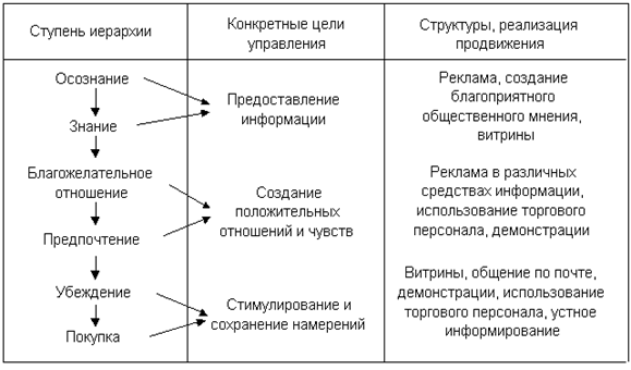 Гольдштейн Г.Я., Катаев А.В. Глава из книги Маркетинг: Учебное пособие для магистрантов Продвижение - любая форма сообщений для информации, убеждения, напоминания о товарах, услугах, общественной деятельности, идеях и т.д. Важнейшие функции продвижения: - создание образа престижности, низких цен, инноваций, - информация о товаре и его параметрах, - сохранение популярности товаров (услуг), - изменение образа использования товара, - создание энтузиазма среди участников сбыта, - убеждение покупателей переходить к более дорогим товарам, - ответы на вопросы потребителей, - благоприятная информация о компании. Цели продвижения: стимулирование спроса и улучшение образа компании. Конкретные действия зависят от так называемой иерархии воздействия (табл. 9.1). Таблица 9.1 Иерархия воздействия продвижения
