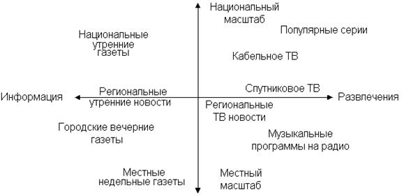 Прессу можно разбить на следующие секторы: национальные газеты, региональные газеты, журналы, профессиональная и техническая литература. Афиши (дорожные плакаты), радио и кино - наименее привлекательные среды передачи сообщений ввиду их специфичности. Исследования в Англии определили позиционирование различных информационных сред (рис. 38).