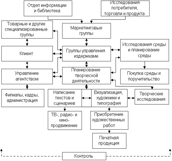 Рис. 39. Организация деятельности рекламного агентства Отличительным преимуществом для большинства рекламных агентств является их творческое искусство. Чтобы достичь этого, большие агентства должны иметь определенных творческих специалистов: