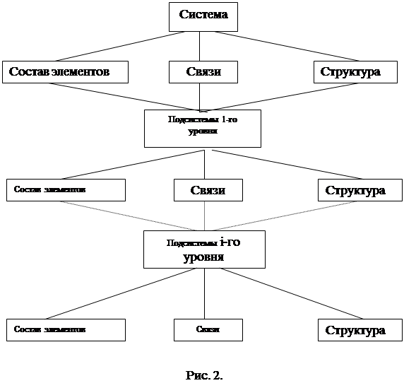 Одна из вершин через серию связей с другими вершинами замыкается на себя, не имея побочного выхода (рис.5). Наличие петель означает нерациональное расходование ресурсов. Обследование большого числа структур различных систем показало, что наличие петель – не такое редкое явление, как может показаться на первый взгляд. Обычно петли могут изыматься из структуры без всякого ущерба для ее функциональных и информационных свойств. Множество подсистем, входящих в петлю, образует изолированную подсистему. Вопросы и упражнения 1. Что называют графом? 2. Что означает выражение “вершины инцидентны ребру”? 3. Какой граф называют ориентированным? Неориентированным? Частично ориентированным? 4. Как графически изображают графы? 5. Чем графы отличаются от структурных схем? В чем их преимущество перед структурными схемами? 6. Как на графе изображается бесполезная избыточность структуры? 7. Постройте граф для структуры системы “учебная группа”. Какого типа получился граф? Является ли он ориентированным? Взвешенным? Имеются ли в нем петли? 6.3. Классы структур Выделим три класса структур: иерархические, неиерархические и смешанные. Для иерархических структур характерно наличие управляющих (командных) подсистем. В неиерархических структурах управляющие функции распределены между всеми элементами или группами элементов. Как правило, наличие иерархии является признаком высокого уровня организации, хотя могут существовать и неиерархические высокоорганизованные структуры. В функциональном отношении иерархические структуры более экономны. Избыточность структуры свидетельствует о нецелесообразном расходе ресурсов, который оправдан только в том случае, если целью является дальнейшее развитие системы, ее морфологическая перспектива. Иерархической называется структура, удовлетворяющая следующим условиям: 1) каждая подсистема является либо управляющей, либо подчиненной, либо (по отношению к разным подсистемам) то и другое одновременно; 2) существует по крайней мере одна только подчиненная подсистема; 3) существует одна и только одна управляющая подсистема; 4) любая подчиненная подсистема непосредственно взаимодействует с одной и только одной управляющей (обратное не верно). Обычно считается, что управляющая подсистема имеет две или более подчиненных. Иерархическую структуру в которой имеется по крайней мере одна управляющая и одновременно подчиненная подсистема, называют многоуровневой. Для многоуровневых иерархических структур справедливо следующее: 1) подсистема более высокого уровня имеет дело с более широкими аспектами поведения системы в целом; 2) время преобразования входных компонент метаболизма в выходные увеличивается с увеличением уровня управляющей подсистемы; 3) подсистемы более высоких уровней иерархической структуры имеют дело с более медленными аспектами поведения системы; 4) с повышением уровня подсистем увеличивается удельный вес информационной компоненты метаболизма и ее роль в функциональной деятельности системы. Неиерархические структуры являются производными от многосвязной структуры, в которой каждая подсистема непосредственно взаимодействует с любой другой. Неиерархическими называются структуры, которые удовлетворяют следующим условиям: 1) существует по крайней мере одна подсистема, которая не явл