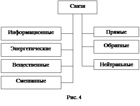 Возможны и смешанные связи. Выделим прямые, обратные и нейтральные связи. Прямые связи предназначены для передачи вещества, энергии, информации или комбинаций от одного элемента к другому в соответствии с последовательностью выполняемых функций. Качество связи определяется ее пропускной способностью и надежностью. Обратные связи в основном имеют функцию управления процессами. Наиболее распространены информационные обратные связи. Обратная связь предполагает некоторое преобразование компонента, поступающего по прямой связи, и передачу результата преобразования обратно, т.е. в направлении, противоположном функциональной последовательности (и прямой связи) к одному из предыдущих элементов системы. Преобразование