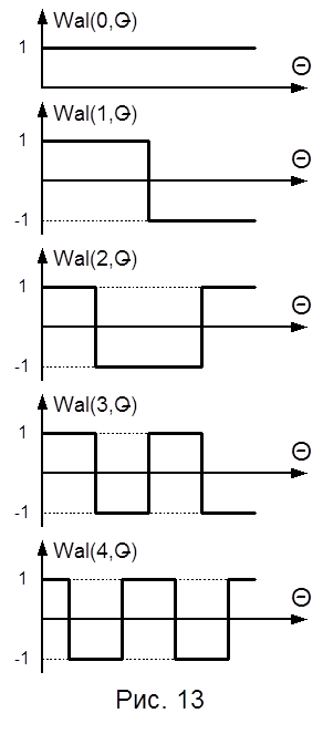 На приёмной стороне в синхронизаторе осуществляется выделение синхросигнала, который запускает ГПФ и сбрасывает интеграторы и ключи. Ортогональные полиномы являются непрерывными аналоговыми сигналами, что приводит к повышенным требованиям к устройствам генерирования и обработки. Но реализация таких систем на основе ЦОС позволяет получить лучшие технические характеристики, чем при использовании ансамбля Уолша (в частности, требуемая полоса меньше). В данном проекте в качестве базисных функций будут использованы функции Уолша вследствие простоты использования на практике и при расчётах. Краткие сведения о функциях Уолша Эти функции известны с 1922 г., но практический интерес к ним возник только в последние 2 – 3 десятилетия в связи с развитием ЭВМ. Существует множество способов задания (определения) функций Уолша.