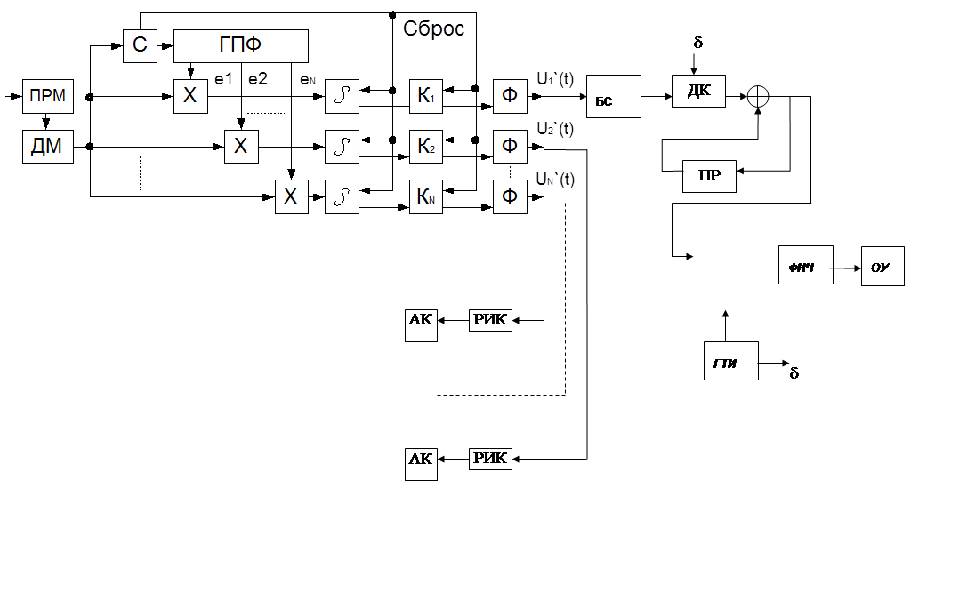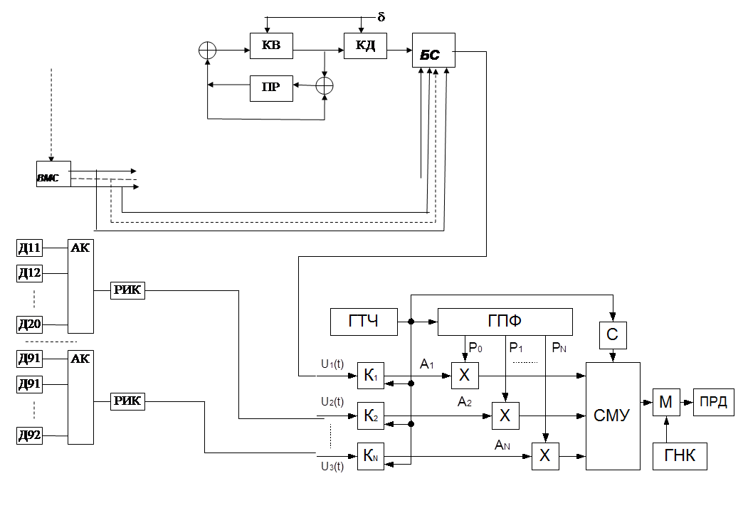 На схеме следующие обозначения: ГТЧ – генератор тактовой частоты, ГНК – генератор несущего колебания, Кi – ключи, ГПФ – генератор полиномиальных функций, СМУ – суммарно-масштабный усилитель, С – синхронизатор.