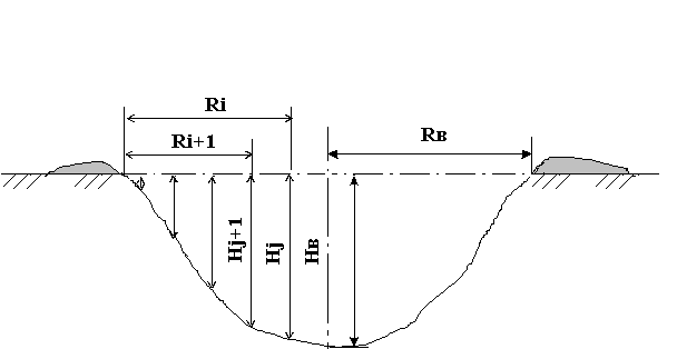 Этот способ имеет весьма низкую точность и не может быть рекомендован к применению. Наиболее точным является способ со съемом профиля воронки. В этом случае через равные отрезки диаметра измеряется высота до стенки воронки. Объем воронки вычисляется как сумма объемов элементарных усеченных конусов: