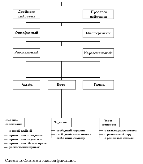 Горячий и холодный переменные объемы формируются независимо друг от друга при движении соответствующих поршней. В двигателе с компоновкой бета имеется один цилиндр, в котором последовательно расположены поршень и вытеснитель, а переменный холодный объем образуется при совместном движении поршня и вытеснителя. Соединение гамма – это в той или иной мере гибрид компоновок альфа и бета, в котором имеются два отдельных цилиндра, как в способе альфа, однако переменный холодный объем образуется способом бета. Эти три типа соединения цилиндров показаны на рисунке 1на примере двигателей с обычным кривошипно-шатунным приводом. в. Способ соединения поршней Способ соединения поршней является дополнительным классификационным признаком. Этот признак подразделяется на более детальные признаки, примеры которых даны ниже. В двигателях Стирлинга применяются три основные формы соединения поршней: 1) жесткое соединение; 2) соединение через газ; 3) соединение через жидкость. В двигателях с жестким соединением используются недеформированные механические звенья, соединяющие движущиеся возвратно-поступательно элементы, которые определяют последовательность изменений объемов в цилиндрах, а также образуют механизм для отвода энергии от двигателя. Типичные механизмы, которые относятся к жестким соединениям, следующие: а) кривошипно-шатунный механизм; б) ромбический привод; в) косая шайба; г) кривошипно-кулисный; д) кривошипно-балансирный механизм; е) механизм Росса. Изобретение двигателя Била и харуэллской машины потребовало введения в классификацию соединения через газ. В этих двигателях взаимное положение поршней определяется газовой динамикой, а не механическими устройствами. Имеется много разновидностей соединения этого типа, например: а) свободнопоршневой двигатель; б) двигатель со свободным вытеснителем; в) двигатель со свободным цилиндром. Последний тип соединения поршней – соединение через жидкость. Необходимо, однако, подчеркнуть, что использование в двигателе Стирлинга жидкого рабочего тела не обязательно означает, что поршни соединяются через жидкость. Например, в двигателе Стирлинга-Мелоуна поршни соединены жестким механизмом. В соединении через жидкость поршни действительно должны соединяться через жидкость. В настоящее время только двигатели "«Флюидайн» попадают в эту категорию. Имеются, по крайней мере три способа, которыми осуществляется соединение через жидкость: а) с помощью реактивной струи; б) с помощью качающегося стержня; в) с помощью разности давлений. Три основных классификационных признака можно также использовать для точной классификации гибридных двигателей, в которых, например, рабочий поршень жестко соединен с выходным валом, однако рабочий поршень и вытеснитель соединены друг с другом через газ. Тем не менее новые формы двигателей могут потребовать дальнейшего расширения предлагаемой классификации. Чтобы проиллюстрировать применение предлагаемой классификационной схемы, втаблице 1 приведена классификация по этой схеме хорошо известных двигателей Стирлинга. Такая система может показаться несколько усложненной, однако простая система оказалась недостаточной для охвата всего разнообразия форм двигателей. В будущем могут быть подобраны подходящие условные обозначения, с помощью которых 