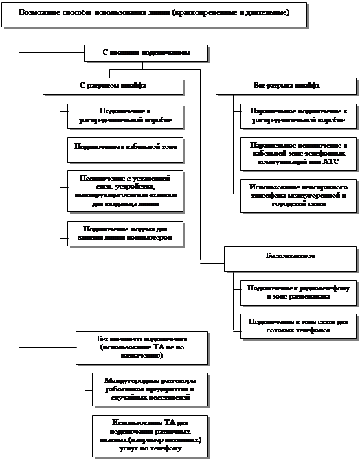 Рис.2. Возможные способы пиратского использования линии Длительное подключение. Уже сам факт длительного использования линии посторонними лицами говорит о том, что эти лица в процессе жизни (или производственной деятельности) находятся где-то рядом (члены семьи, соседи, сотрудники), либо показывает особую уязвимость данного абонентского комплекта ТА для пиратского подключения (вскрытые шкафы и распределительные коробки, отсутствие контроля за использованием телефона, отсутствие элементарных средств защиты). Для пиратского подключения используются либо обычные ТА, либо специальные устройства подключения, обеспечивающие скрытое подсоединение к двухпроводному шлейфу и имитацию всех основных сигналов АТС для хозяина линии. В течение собственно момента самовольных разговоров владельцу абонентской линии имитируется либо сигнал "занято", либо сигнал "контроль посылки вызова". В остальное время владелец линии пользуется ТА беспрепятственно. Выявление таких приборов достаточно сложно, но возможно путем анализа статистики по оплате телефонных разговоров (например, по выставленным распечаткам - счетам за междугородные переговоры). Как правило, в подобных случаях нелегалы не злоупотребляют телефонным временем, боясь огласки. Для них важна сама возможность постоянно пользоваться линией. К области длительных подключений относится так же использование телефонного аппарата не по назначению, например, сотрудниками предприятия, фирмы либо детьми в собственной квартире. Вероятность подобного развития событий достаточно велика. Самовольное подключение без разрыва шлейфа. К такому виду подключений относится: параллельное подключение в распределительной коробке, в кабельной зоне АТС либо использование неисправного телефона (а также некоторых особенностей механизма кассирования монеты, жетона). Для этих подключений характерно прослушивание (подзвякивание) набора номера на аппарате владельца линии, что заставляет нелегалов пользоваться линией в отсутствие хозяина. Но это же обстоятельство служит средством выявления самого факта подключения. Подзвякивание ТА, перехват чужих разговоров, все это верные признаки параллельного самовольного подключения. Подсоединение к двухпроводному шлейфу производится чаще всего с помощью обычного ТА разъемами типа "крокодил" либо иголками в открытых распределительных шкафах, колодцах, после чего практически не остается никаких следов подключения (естественно кроме финансового ущерба). Самовольное неоплаченное использование таксофонов также ощутимо влияет на величину финансовых потерь линейных узлов связи. Один из возможных способов: длительное повторное использование первой неоплачиваемой минуты на некоторых типах междугородных таксофонов. Кроме этого, для таксофонов так же характерно и подключение к проводному шлейфу, как и для обычных ТА. Достаточно часто встречается и применение самодельных жетонов, монетозаменителей, карточек. Самовольное подключение с разрывом шлейфа. Бывает: в распределительной коробке, в кабельной зоне АТС, подключение имитатора либо модема (факса). Характеризуется высокой степенью скрытности проведения самовольных разговоров. Практически невозможно выявить факт подключения в момент его проведения. Если после подключения проводка линии восстана