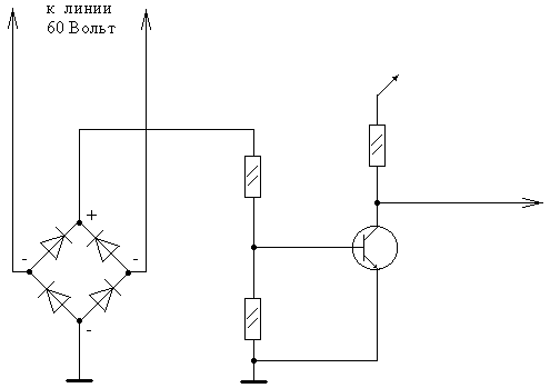 Рис.4. Индикатор состояния линии В состав схемы входят: · мост униполярного подключения – VD1-VD4; · специальный делитель контроля падения напряжения – VD5, R1, VD6, R2; · переключающий элемент И-НЕ – DD1.1. Сочетание в делителе резистивных (Rl, R2) и нелинейных элементов (в частности, стабилитрона VD6) позволяет подключить элемент DD1.1 непосредственно к линии, а также получить порог переключения элемента DD1.1 не ниже 35В. В результате, данная схема может уверенно отработать падение напряжения как при установке у абонента, так и при установке на кроссе АТС. Рис.5 поясняет сказанное.