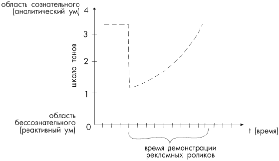 Рис. 1. Изменение эмоционального состояния при просмотре рекламы Пунктиром на графике показана кривая эмоционально-психического состояния человека. Это резкое падение по шкале тонов сродни удару обухом по голове. В первые мгновения потребитель оглушен, он фактически находится с отключенным сознанием и передоверяет свои мыслительные способности тому, кто окажется на пол тона выше. Если рекламный ролик составлен со знанием дела и особенно с учетом тоновой политики, то успех ему обеспечен: все сказанное с экрана будет восприниматься как внушение, как гипнотический приказ. В дальнейшем тон зрителя восстанавливается (например, до уровня скуки, тон 2,5). Соответственно уровень гипнабельности снижается. Поэтому второй, третий, четвертый и т.д. рекламные ролики в блоке будут обладать меньшим эффектом воздействия. Грамотный рекламодатель не заинтересован в такой вещи, как рекламные блоки. Ему хотелось бы, чтобы реклама шла не блоками, а одиночными роликами, внедряясь в структуру фильмов и передач. Государство же и СМИ, напротив, предпочитают, охраняя психику населения, давать рекламу блоками. Возникает борьба (в Великобритании, например, она закончилась в пользу государства: законом запрещено прерывать передачи на телевидении рекламой). Из анализа приведенной выше ситуации следует однозначный вывод: для достижения успеха – в данном случае воздействия на психику потребителя – качество рекламной продукции не имеет принципиального значения. Во всяком случае, это характерно для обществ, средний тон потребителя которых находится в пределах тона 2,0 (±0,5). Важно не качество, а количество. Даже самый красивый рекламный ролик в мире не принесет успеха рекламодателю, если он будет показан лишь раз либо от случая к случаю. В рекламной компании гораздо важнее повторяемость. Чем чаще потребитель будет сталкиваться с рекламой того или иного товара, тем он больше будет внутренне злиться, раздражаться и соответственно тем беспомощней будет его психика в сложившиеся ситуации. Если добиться того, что кривая эмоционально-психического состояния человека (см. рис.1) все время будет оставаться внизу – в области тонов 1,5...2,0, – то этим вы по существу полностью подчините себе потребителя и одержите над ним верх. Далее можете «брать его голыми руками». Можно спросить: а зачем тогда вообще добиваться качества рекламной продукции? Тут вступают в силу совершенно другие законы – конкуренции между рекламными компания, агентствами. Рекламодатель выберет то из них, которое сможет его больше удивить и польстить его самолюбию. Но для потребителя это в конечном счете не будет иметь особого значения. Нужно исходить из того, что рекламодатель обычно не представляет себе до конца, что он хочет от рекламного агентства. Формально ему хотелось бы заказать «красивый, достойный» ролик, чтобы оправдать затраченные средства. На самом деле целью рекламодателя всегда должен оставаться сбыт рекламируемой продукции, хотя это не всегда осознается на сознательном уровне. Отсюда для рекламных агентств вытекают две совершенно различные линии поведения (две стратегии): первая – подыгрывать рекламодателю и тешить его самолюбие, угождать ему, изображая то, что рекламодателю хочется видеть, и вторая – убедить рекламодателя, что рекламное агентство лучше его знает, что такое р