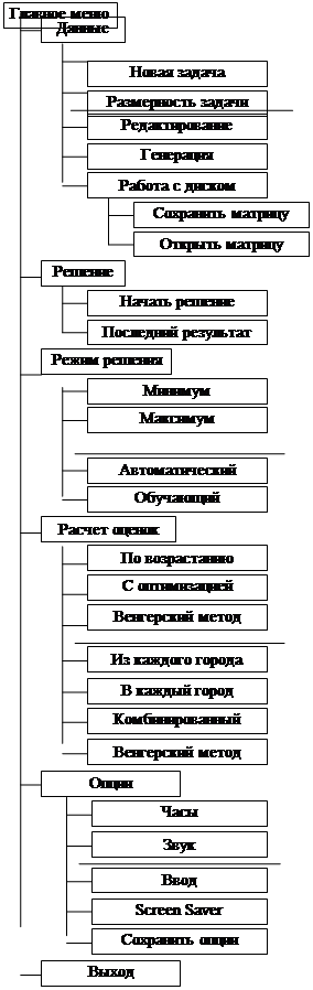 Рассмотрим меню по пунктам: Данные. Новая задача. Этот пункт меню вызывает сначала процедуру ввода размерности задачи, затем процедуру ее редактирования. При вызове производится обнуление всех текущих значений матрицы. Данные. Размерность задачи. Данный пункт меню активизирует процедуру изменения размерности задачи. При этом если матрица уменьшается, то значения в отсеченной части не зануляются и при последующем увеличении размерности могут быть снова использованы. В случае увеличения размера на большее значение крайние элементы оказываются нулевыми. Данные. Редактирование. Пункт активизирует процедуру по вводу начальной матрицы условий. В процедуре реализован вертикальный и горизонтальный скроллинг матрицы, а также скроллинг внутри вводимой строки. Кроме того возможна настройка ширины строки ввода, которая описана в пункте меню "Опции. Ввод". Данные. Генерация. Пункт активизирует процедуру, генерирующую матрицу случайным образом в заданном диапазоне значений, который задается перед генерацией. Данные. Работа с диском. Сохранить матрицу. Данный пункт позволяет сохранить текущую исходную матрицу в файл на диск. Может быть активизирован в любой момент работы меню клавишей F2. Данные. Работа с диском. Открыть матрицу. Данный пункт позволяет считать с диска исходную матрицу. Может быть активизирован в любой момент работы меню клавишей F3. Решение. Начать решение. Данный пункт запускает работу алгоритма решения, используя текущие настройки. Решение. Последний результат. Данный пункт позволяет вывести последний полученный результат решения. Режим решения. Блок: Минимум - Максимум. Этот блок позволяет выбрать направление решения задачи на минимум или на максимум. Значение по умолчанию - Минимум. Режим решения. Блок: Автоматический - Обучающий. Этот блок позволяет выбрать между автоматическим и обучающим режимами решения задачи. Значение по умолчанию - Автоматический. Расчет оценок. Блок "Верхняя оценка". Этот блок позволяет выбрать метод расчета верхней оценки. При выборе третьего метода расчета ("Венгерский метод"), при решении автоматически устанавливается четвертый метод расчета нижней оценки ("Венгерский метод"). Значение по умолчанию - Венгерский метод. Расчет оценок. Блок "Нижняя оценка". Этот блок позволяет выбрать метод расчета нижней оценки. Какого-либо влияния на метод расчета верхней оценки выбор не оказывает. Значение по умолчанию - Венгерский метод. Опции. Часы. Данный пункт позволяет включить и выключить часы. Опции. Звук. Данный пункт позволяет включить и выключить звук. Опции. Ввод. Данный пункт позволяет задать ширину строки ввода при редактировании начальной матрицы задачи. Значение по умолчанию - 6. Опции. Screen Saver. Данный пункт позволяет задать время задержки срабатывания Screen Saver-а. Время указывается в минутах. Значение по умолчанию - 5 минут. Опции. Сохранить опции. Данный пункт позволяет запомнить состояние часов и звука в файле (Shadow.dsk). Выход. Данный пункт осуществляет выход из программы. Описание программыСтруктурно программа состоит из девяти модулей: Процедуры, которые используются при решении задачи описаны ранее. Можно лишь добавить, что общее управление алгоритмом ветвей и границ осуществляется процедурой OverDrive в автоматическом режиме решения и процедурой StudyMode в обучающем режиме решения. Процедур