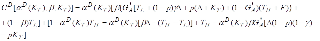 Определение 1 . Условимся называть налогоплательщика честным, если KT ³ K*T ,и нечестным, если KT < K*T . Обозначим aH вероятность того, что честный налогоплательщик решится уклониться от налогов; aH (KT ) - вероятность того, что нечестный налогоплательщик, для которого наказание за взятки составляет KT , скроет свой высокий доход. Поскольку для налоговой инспекции априори все налогоплательщики равны, то р - вероятность проверки низкого дохода - одинаковая для всех. Пуст CH (aH ,b) будет функцией общих расходов, которые отнесет честный налогоплательщик, скрывающий свой доход, и CD [aH (KT ), b;KT ] - функцией расходов нечестного налогоплательщика, уходящего от уплаты налогов, для которого наказание за взятку составляет KT . Тогда,
