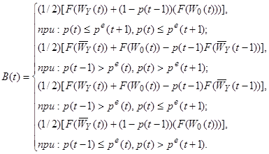 Если (41) не удовлетворено, то молодой бюрократ в t не предполагает принимать взятку в период t + 1. Тогда (40) эквивалентно 1 – h – p(t)C ³ 0. Пусть Wy (t) = 1 - p(t)C. Молодой бюрократ с честностью h примет взятку тогда и только тогда, когда Wy (t) ³ h (45) При этом Пусть B(t) - доля коррумпированных среди всех бюрократов поколения в момент времени t. B(t) является средним арифметическим между долями старых и молодых коррумпированных бюрократов, которые принимают взятки в момент t. Эта величина используется для измерения уровня коррупции в экономике в момент времени t. Предыдущие результаты могут быть представлены следующими четырьмя случаями: