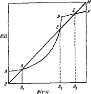 Решение можно представить на фазовой диаграмме. На рис. 2 изображена диаграмма изменения B(t) от В(t - 1). Кривая ABCD соответствует (50). Она пересекает линию ОМ (эта линия имеет наклон 45%) в двух точках, B и С. Прямая DF, представляющая уравнение (51), пересекает линию ОМ в точке Е. Таким образом, существует три точки равновесия и легко может быть показано, что только в точках В и Е оно является устойчивым. Если изменить предположение о соотношении вероятностей проверки и их ожидаемых значениях, то, как показано в [78] (с помощью численного моделирования), вместо рис. 2 получаем рис. 3. Из рисунка видно, что если первоначальное значение переменной B(t - 1) больше, чем В2 , или если В(t - 1) настолько мало, что B(t) выше точки С, то B(t) сойдется к точке Е. В других случаях B(t) сойдется к точке В. В [78] исследуется, как зависят равновесные уровни коррупции от параметров модели, и подчеркивается разница между малыми и значительными изменениями в параметрах, так как их последствия отличаются. Алгебраически более удобно иметь дело со стационарной вероятностью проверки р*, чем с В*. По уравнению (49) р* связана со стационарным равновесным уровнем коррупции В* следующим уравнением: p* = A – kB* (52) Из рис. 3 следует, что есть три возможных состояния равновесия для B(t). Это - В, С и D. Первые два определяются из уравнения Cfkp*2 – [fk(2C+1)]p* +(2fk – A) = 0 (53) Легко видеть из (52), что B* отрицательно связан с P* , следовательно, результаты, получаемые из последнего уравнения, можно интерпретировать следующим образом. Если штраф С или ресурсы на проверку R растут незначительно, то В* падает. С другой стороны, если средний уровень честности h в экономике падает, то f и В* повышаются, что представляется естественным. Так как кроме точки в точка Е также является стационарным решением, интересно исследовать ее зависимость от параметров. Из (51) следует, что в точке Е B* = (2 – A)/(2 – k) (54) Этот уровень В* не зависит от размера штрафа С. Однако когда ресурсы на проверку R повышаются, то и A, и k растут в одинаковых пропорциях, поэтому В* падает. Следовательно, для экономики с высоким уровнем коррупции изменения R могут снизить уровень коррупции, а небольшие изменения С- не могут. Особый интерес вызывает вопрос о переходе экономики с одного уровня коррупции на другой. Исследование такого вопроса говорит о том, что когда общество становится более снисходительным к коррумпированным бюрократам, то возможно резкое повышение уровня коррупции. Более того, однажды появившись, высокий уровень коррупции остается, даже если параметры ограничительной схемы вернутся на прежний уровень. Это объясняет существование обществ с резко отличающимися уровнями коррумпированности и одинаковыми ограничительными схемами. Интуитивное объяснение этого факта состоит в том, что, однажды возникнув, коррупция требует более высоких затрат на проверку и сдерживание. Усилия правительства становятся менее эффективными. Кроме того, из модели следует, что из-за возможности перехода от одного равновесного состояния к другому иногда тяжелая ограничительная схема, казавшаяся неоптимальной в короткий период, становится оптимальной в долгосрочный. В то же время в ряде случаев грубая схема (например, введение высоких штрафов С) может вызвать обратный эффект, переведя экономику, находящуюся на низком уровне коррупции (в точке В), на высокий уровень (в точку