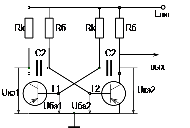 Рисунок 6 – Схема мультивибратора на транзисторах Исходные данные: амплитуда положительного импульса UKu =12 В, длительность tu 1 =10 мкс, длительность фронта tф1 ≤1,0 мкс, длительность среза tc 1 ≤2 мкс, период следования T=40 мкс Rн =2 кОм, максимальная температура окружающей среды t°окр =+40°С. Выбор типа транзистора. Транзистор выбирается по определенной частоте fh 21б =100 (МГц) максимально допустимому напряжению UКБ max =10 (В) и статическому коэффициенту передачи по току h21Э =120. Так как транзистор в схеме мультивибратора работает в ключевом режиме, поэтому выберем широко используемый маломощный высокочастотный транзистор типаКТ315 с параметрами: fh 21б =100 (МГц), UКБ max =10 (В), h21Э =120, Iэ =5 (мА), Ik = 20 (мА), UКЭ = 10 (В). Так как скважность определяется выражением