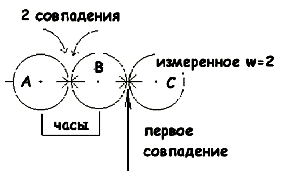 Рис. 3. Легко посчитать, каким образом будут складываться вращения. Допустим, для простоты, что система отсчета B зафиксировала совпадение "меток" с измеряемой системой C за два собственных оборота, за 2 условные секунды, - тогда измеряемой системе приписана скорость в 2[с/м]. Всякий раз, по "часам" отсчитывается два оборота, прежде чем измеряемая система сделает один. (Образно выражаясь, длина "суток" системы C - один ее оборот – это 2 оборота стрелки на наших часах, где системы A и B - это циферблат и часовая стрелка. Понятно, почему люди измеряют время на Земле именно ТАК.) Теперь пусть измеряемая система, ставшая новой системой отсчета, точно также зафиксирует такую же скорость вращения у новой системы D. Но это означает, что в первоначальной системе отсчета B скорость этой последней будет измерена уже как 4 оборота до первого совпадения меток! То есть 2[с/м]+2[с/м]=4[с/м] - в полном соответствии с арифметическим законом сложения скоростей. Фокус в том, что собственная условная секунда в системе C измеряется по отношению к B, которая, конечно, до этого совпадения уже успела сделать один собственный оборот. Но в таком "фокусе" нет ничего удивительного, ведь никакого абсолютного времени нет, есть только собственные обороты - условные секунды - которые возникают через определение совпадений меток системы отсчета с метками той, относительно которой начался отсчет оборотов. А теперь отметим главную особенность нашей модели. Если мы строим относительность вращений по аналогии с относительностью для поступательного движения, то мы должны предположить, что две системы вращения, A и B, которые сравнивались первоначально, должны приписать друг другу равные скорости вращения. Но у нас этого вроде бы нет: мы говорим только о совпадении меток, которое позволяет системе B зафиксировать свой полный оборот. Если мыслить по аналогии, B должна тогда приписать системе A также только один оборот, но мы начали с того, что заявили: эта система A может "на самом деле" совершить и большее число, главное – чтобы метки совпали. Кроме того, читатель, наверное, уже обратил внимание, что измеряемой системе я сразу приписал скорость в 2[с/м], но, если мыслить по аналогии, мы должны были бы рассмотреть системы A, B и C, так, чтобы вращения A и C относительно центральной системы отсчета B были единичны и равны между собой. Вспомним, как мы измеряем относительные скорости для поступательного движения: если скорость точки B относительно системы отсчета A задается единичной, а в системе B имеется точка C, движущаяся с единичной скоростью, то симметрия такова, что относительно точки B скорости A и C равны. ¬ A · B· · C ® Рис. 4. Да, они равны по модулю, но ПРОТИВОПОЛОЖНО НАПРАВЛЕНЫ. Тогда аналогом этого симметричного случая в нашей модели станет следующая ситуация: