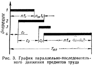 Необходимость выравнивания (синхронизации) длительности отдельных операций существенно ограничивает возможность широкого применения параллельного вида движения, что способствует применению третьего – параллельно-последовательного вида движения предметов труда. Параллельно-последовательный вид движения предметов труда характеризуется тем, что процесс обработки деталей (сборки машин) данной партии (серии) на каждой последующей операции начинается раньше чем полностью заканчивается обработка всей партии деталей (сборки машин) на каждой предыдущей операции. Детали передаются с одной операции на другую частями, транспортными (передаточными) партиями. Накопление некоторого количества деталей на предыдущих операциях перед началом обработки натрии на последующих операциях (производственный задел) позволяет избежать возникновения простоев. Параллельно-последовательный вид движения предметов труда позволяет значительно уменьшить продолжительность производственного процесса обработки (сборки) по сравнению с последовательным видом движения. Применение параллельно-последовательного вида движения экономически целесообразно в случаях изготовления трудоемких деталей, когда длительности операций процесса значительно колеблются, а также в случаях изготовления малотрудоемких деталей крупными партиями (например, нормалей мелких унифицированных деталей и т. д.). При параллельно-последовательном виде движения предметов труда могут быть три случая сочетания длительности операций: 1) предыдущая и последующая операции имеют одинаковую длительность (t1 = t2); 2) длительность предыдущей операции t2 больше длительности последующей t3, т. е. t2 > t3; 3) длительность предыдущей операции t3 меньше длительности последующей t4, т. е. t3 < t4. В первом случае передача деталей с операции на операцию может быть организована поштучно; из соображения удобства транспортировки может быть применена одновременная передача нескольких деталей (передаточной партией). Во втором случае последующая, менее продолжительная операция может быть начата только после окончания обработки всех деталей на предыдущей операции, входящих в первую передаточную партию. На рис. 3 это имеет моего при переходе от первой операции ко второй. В третьем случае (на рис. 3 – переход от 3 к 4-й операции) нет необходимости накапливать детали на предыдущей операции. Достаточно передать одну деталь на последующую операцию и начать ее обработку без всякого опасения возможности возникновения простоя. В этом, как и в первом случае, передаточная партия устанавливается только из транспортных соображений. Момент начала работы на каждой следующей операции (рабочем месте) определяется по графику или путем расчета минимальных смещений с. Минимальное смещение с2 определяется разностью между длительностями предыдущей большей t2 и последующей меньшей операциями t3, а именно: с2 = n * t2 – (n – nòð) * t3, где nтр – величина передаточной (транспортной) партии, которая для второго случая сочетания длительности операций определяется из соотношения ñ1 / t1 (ñ1 – минимальное смещение первой операции), во всех остальных случаях – из условий удобства транспортировки.