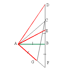 Задача 9. Построения под заданным углом На местности обозначены точки А и В. Найдите точки C, в и E, для которых выполнены равенства Решение! Проложим перпендикуляр к прямой АВ, пересекающий в какой–то точке луч АВ. Без ограничения общности считаем для удобства, что эта точка пересечения и есть точка В. На перпендикуляре по разные стороны от точки В отложить точки С и F, удалённые от точки В на расстояние АВ. Тогда угол ВАС равен 45° (из равнобедренного прямоугольного треугольника АВС). На прямой AF отложим точку G на расстоянии АВ от точки А, а затем на прямой ВС отложим точку в на расстоянии CG от точки В. Тогда угол ВАD равен 6О°, так как по теореме Пифагора для прямоугольного треугольников АВС, ACG и ABD имеют место равенства