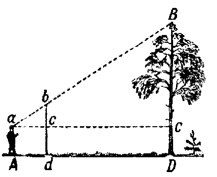 Задача 10. Измерение высоты дерева. Высоту деревьев можно определить при помощи шеста. Этот способ состоит в следующем. Запасшись шестом выше своего роста, воткните его в землю отвесно на некотором расстоянии от измеряемого дерева. Отойдите от шеста назад, по продолжению Dd до того места А, с которого, глядя на вершину дерева, вы увидите на одной линии с ней верхнюю точку b шеста. Затем, не меняя положения головы, смотрите по направлению горизонтальной прямой aC, замечая точки с и С, в которых луч зрения встречает шест и ствол. Попросите помощника сделать в этих местах пометки, и наблюдение окончено. Остаётся только на основании подобия треугольников adc и aBC вычислить ВС из пропорции ВС : bc = aC : ас, Расстояния bc, aC легко измерить непосредственно. К полученной величине ВС нужно прибавить расстояние CD (которое также измеряется непосредственно), чтобы узнать искомую высоту дерева.