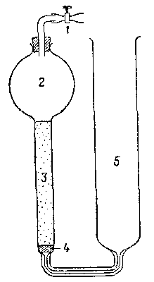 Рис. 1. Сатуратор Бренстеда — Дэписа. 1 – винтовой зажим, 2 – емкость, содержащая растворитель, 3 - колонка с тонкоразмельченным насыщающим твердым веществом; 4— пористая стеклянная прокладка; 5 - емкость, содержащая насыщенный раствор. Равновесие между твердой фазой и раствором может быть достигнуто или встряхиванием в закрытом сосуде, или пропусканием водной фазы через сатуратор, наполненный твердым веществом; тип сатуратора, примененный Дэвисом и сотрудниками, показан на рис. 1. Равновесие следует устанавливать в термостате. Так как часто равновесие достигается медленно, следует проверять, получается ли одинаковое значение растворимости при ненасыщенной или пересыщенной начальной водной фазе, а также через различные промежутки времени. Равновесие в инертных системах [например, аммиакаты кобальта(Ш)] достигается быстрее с помощью катализатора. Иногда необходимо покрывать внутреннюю поверхность сосудов и пробок парафиновым воском или силиконом для того, чтобы избежать потерь растворенного вещества вследствие сорбции на стекле. Твердая фаза может быть отделена от насыщенного раствора фильтрованием или центрифугированием, которые следует проводить при температуре равновесия. Особенно удобно помещение с постоянной температурой, но, если его нет, фильтрование можно легко выполнить в термостате. Например, установление равновесия и последующее разделение можно проводить в термостатированном сатураторе Дэвиса со встроенным фильтром. Если равновесие проводится в отдельных сосудах, то фазы могут быть разделены с помощью пипетки с пористым фильтром или термостатированного ультрафильтра Тиссена под давлением от 2 до 3 атм. Хотя и трудно проводить центрифугирование точно при температуре равновесия, если нет термостатирующего помещения, все же кристаллизацию из горячих растворов можно предотвратить продуванием горячего воздуха через центрифугу и с помощью подогретых пипеток для удаления водной фазы. Фазы могут иногда быть отделены более полно, если прокладка из ваты центрифугируется на поверхности твердого вещества. Выбор аналитического метода в основном зависит от величины измеряемой растворимости. Умеренно высокие значения обычно определяют гравиметрическим или объемным методом, а низкие значения - полярографическим, колориметрическим или радиометрическим методами. Незаряженные формы могут быть иногда отделены от насыщенного раствора экстракцией. Так, растворимость углеводородных лигандов в водных растворах серебра (I) была определена спектрофотометрически после экстракции лиганда гексаном, в то время как растворимость дитизона в буферных растворах измерялась добавлением избытка радиоактивного серебра, экстрагированием дитизоната серебра хлороформом и определением активности в органической фазе. Хотя измерение растворимости обычно включает анализ насыщенного раствора, были выполнены также эксперименты по смещению ряда растворов известной концентрации с последующим определением веса образовавшегося осадка. 2. Прямой метод растворимости В простейшем случае измерения растворимости применяются для изучения равновесия, когда единственными формами, присутствующими в обеих фазах (кроме растворителя и ионной среды), являются формы, образованные из центральной группы В и лиганда А. Серьезным недо