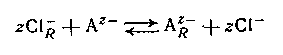 где подстрочная буква R обозначает фазу смолы. Нерастворимые амины или четвертичные аммониевые соли могут подвергаться подобным реакциям обмена с анионами в растворе, например,