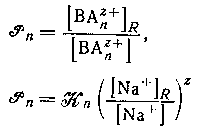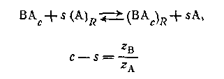 между анионным лигандом А и обменником в хлоридной форме. Большинство анионитов является несколько неустойчивыми смолами с высоким молекулярным весом, но на практике также применяются жидкие амины с умеренно низким молекулярным носом. Из уравнений очевидно, что изучение полного распределения центральной группы В или лиганда А между ионообменииком и водной фазой может дать ценные сведения о формах, присутствующих в растворе. Еще в 1922 г. было проведено первое, хотя и безуспешное исследование комплексов металлов с помощью синтетического цеолита, но ионный обмен не применялся для изучения равновесия в растворе до конца 1945 г., когда стали легко доступными синтетические смолы. Как катиониты, так и аниониты использовались для определения природы форм, присутствующие в растворе, но обычно катиониты более пригодны для определения констант устойчивости. 1. Катионный обмен Коэффициент распределения катиона