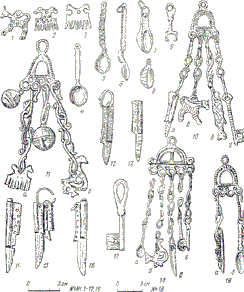 Рис. 1. Языческие привески-амулеты 1—Саки, курган 55; 2 — Бочарово, курган 8; 3 — Новоселки, курган 2; 4 — Грозпвица. курган 1; 5 — Исакове, курган 443; 6, 7 — погребения ливов; S — Бочарово, курган 5; 9 — Низинка, случайная находка; 10 — Смяличи, курган 1; 11 — Бочарово, курган 21; 12 — Приедес, курган 14; 13 — Цесисский район ЛатвССР, случайная находка; 14 — Колчино, курган 58; 15 — Лашковицы, курган 38; 16 — городище Лыхавере; П — Кузнецы и Чалых, курган 1; IS — Коханы, курган 11; 19 — Беседа, курган 145
