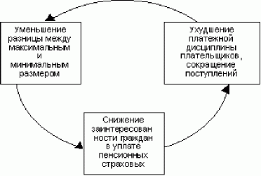 А.П. Колесник, профессор кафедры ММЭП, зам. председателя правления Пенсионного фонда России Когда не ведают далеких дум, то не избегнут близких огорчений Конфуций, 551-479 гг. до н.э. Правительством Российской Федерации в IV кв. 1997 г. дважды рассматривались варианты Программы пенсионной реформы в Российской Федерации и на заседании в декабре того же года принят умеренный вариант (далее Программа), предусматривающий эволюционные изменения с учетом развития демографической ситуации в стране [1]. Постановление по этому вопросу было подписано тог-даш-ним председателем Правительства РФ С.В. Кириенко 20 мая 1998 г. [2]. Программа пенсионной реформы Исходя из роли пенсионной системы в обществе, принятую Правительством РФ Программу можно рассматривать с разных точек зрения, наиболее важные из которых - социальная и финансовая. С социальной точки зрения существенные решения, содержащиеся в принятом варианте Программы, заключаются в следующем: сохранение пенсионных прав, заработанных гражданами за предыдущие периоды (до реализации Программы); поддержание приемлемого для общества уровня пенсий и тарифов страховых взносов; установление более справедливых правил определения размера пенсий при их назначении; усиление заинтересованности граждан в контроле за финансированием пенсий, в том числе и за уплатой страховых взносов; более активное привлечение объединений работающих для решения принципиальных вопросов профессионального пенсионного обеспечения. С финансовой точки зрения основными задачами, предусмотренными в Программе, являются: привлечение дополнительных финансовых источников для финансирования пенсионной системы; изменение отношений участников пенсионной системы (работающие, работодатели, пенсионеры, государство) таким образом, чтобы новые отношения поддерживали ее эффективную работу, в частности не допускали образования просроченной задолженности плательщиков страховых взносов в Пенсионный фонд РФ (на начало 1999 г. просроченная задолженность всех плательщиков, накопленная ими с начала 90-х годов, превысила 100 млрд руб.). Привлечение дополнительных финансовых источников для финансирования пенсионной системы предполагается осуществлять путем более активного участия отраслей в финансировании пенсий для лиц, работавших в отрасли (создание профессиональных пенсионных систем), а также путем использования инвестиционного дохода от операций на финансовом рынке по размещению пенсионных резервов. Часто встречающийся при обсуждении Программы вопрос заключается в следующем: не будет ли более целесообразным подождать с реформированием в пенсионной сфере до стабилизации в экономике или до ощутимого экономического роста? Рассмотрим этот вопрос, исходя из устойчивой самоподдерживающейся тенденции [3], имеющей место в настоящее время в системе пенсионного обеспечения. Эта тенденция ведет к выравниванию размеров пенсий (снижению дифференциации). Она образовалась в России (как и в других государствах на территории бывшего СССР) с начала 90-х годов в результате скачкообразного повышения стоимости жизни. Смысл ее иллюстрируется следующей схемой, характеризующей самоподдерживающийся процесс.