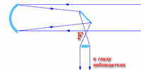 Зеркальные телескопы. У простых зеркальных телескопов, телескопов-рефлекторов, объектив - это сферическое зеркало, которое собирает световые лучи и отражает их с помощью дополнительного зеркала в сторону окуляра - линзы, в фокусе которой строится изображение. Рефлекс – это отражение. Зеркальные телескопы не грешат хроматической аберрацией, так как свет в объективе не преломляется. Зато у рефлекторов сильнее выражена сферическая аберрация, которая, кстати говоря, сильно ограничивает поле зрения телескопа. В зеркальных телескопах так же используются сложные конструкции, поверхности зеркал, отличные от сферических и прочее.