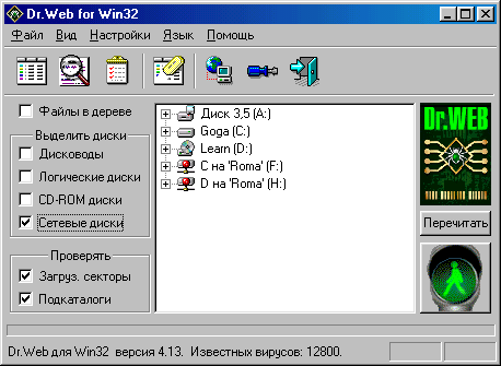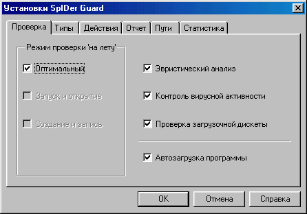 SpIDer перехватывает обращения к файлам и системным областям дисков и осуществляет их проверку на наличие вирусов "на лету". При обнаружении вируса SpIDer в автоматическом или полуавтоматическом (т.е. запрашивая пользователя о том, какие действия предпринять) режиме предпринимает действия по обезвреживанию или блокированию вируса таким образом, что доступ к объекту разрешается только в том случае, если последний не содержит вирусов - т.е. либо вирусов в нем не обнаружено, либо удалось их обезвредить. Кроме того, SpIDer поддерживает специальный режим работы, в котором обнаруживается и блокируется вирусная активность, т.е. попытки вирусов, в том числе неизвестных и даже неопределяемых эвристическим анализатором, заражать объекты на дисках компьютера. Для анализа объектов на вирусы SpIDer использует ту же вирусную базу и то же ядро, что и традиционный сканер DrWeb. В процессе загрузки SpIDer проводит тестирование оперативной памяти компьютера. После загрузки SpIDer его иконка помещается в правую часть панели задач Windows (SystemTray). Нажатием правой кнопки мыши на этой иконке можно вызвать на экран меню SpIDer, а двойным нажатием левой кнопки - его панель настройки.