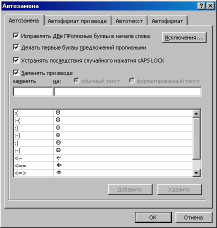 Чтобы дополнить словарь Автозамены нужно: 1. Выбрать команду Сервиз\Автозамена . Появится диалоговое окно Автозамена 2. Задать параметры, которые будут использоваться. 3. Если вы вводите элементы в поля Заменить и На, щелкните на кнопке Добавить , чтобы включить их в список словаря Автозамены. Чтобы удалить элемент из списка, выделите его и щелкните на кнопке Удалить. 4. Щелкните на кнопке OK , чтобы закрыть диалоговое окно.Если вы сделали пункты 1-4, то при наборе в документе слова, идентичного помещённому в поле Заменить и символа пробела за ним, оно замещается на слово (словосочетание) из поля На.