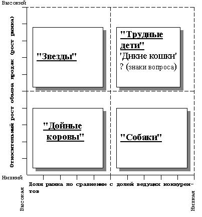 Маркетологу необходимо выбрать оптимальный момент для выхода с новым товаром на рынок или для внедрения существующего товара на новый рынок. В одно и то же время один товар может находиться на различных рынках на разных стадиях жизненного цикла. Продолжительность этапов на различных рынках также может быть различна. Все это необходимо учитывать при составлении товарного портфеля фирмы. Желательно, чтобы фирма с широким ассортиментом имела одновременно товары, находящиеся на этапах внедрения, роста и зрелости. В этом случае доход от реализации товаров, находящихся на стадии зрелости, способствует эффективному внедрению новых товаров, а товары, находящиеся на стадии роста, могут дать дополнительные средства для обновления, разработки модификаций, введения скидок к цене на товары, находящиеся на стадии зрелости. Нужно так сформировать товарный портфель, чтобы постоянно вводить новые товары и одновременно поддерживать сбалансированность товаров, находящихся на различных этапах жизненного цикла. Матрица Бостонской консультативной группы (Boston Consulting Group) Данная матрица представляет собой важный инструмент для проведения ассортиментного анализа, оценки рыночных перспектив товаров, выработки эффективной сбытовой политики, формирования оптимального товарного портфеля фирмы.