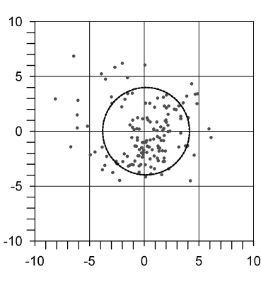 Рис.2. Измерение магнитного поля на профиле, а - рядовое измерение, б - контрольное измерение, в - измерение на пикете. Геодезические приемники GPS, обладающие максимальной точностью позиционирования (до нескольких мм в дифференциальном режиме), менее удобны в транспортировке, достаточно дороги и требуют дополнительной обработки данных, поэтому рассмотрена возможность применения совместно с магнитометром портативных навигационных приемников GPS. Вопросы применимости их в геофизических работах рассмотрены в частности в [7] и [8]. Экспериментально погрешность плановой привязки навигационным приемником GPS изучена во время проведения комплекса геофизических работ на о.Уруп. Координаты более 400 пикетов, расположенных на двух участках 2?2 км были записаны навигатором Garmin III+, сопряженным с магнитометром, а также с помощью геодезических измерений (с применением тахеометра и геодезических приемников GPS Trimble). Измерения координат проводились в разное время в течение 3 месяцев, на каждой точке измерение бралось однократно. Диаграммы, иллюстрирующая разность полученных координат, приведены на рис.3. Нулю соответствует <точное> измерение, полученое топосъемкой, точка изображает отклонение координат, полученных приемником GPS Garmin от <точных>. Число определений координат на участках Купольный (а) и Айнский (б) составило 157 и 260, а среднеквадратичная погрешность 4 м и 2 м соответственно. Условия видимости спутников в районе каждого пикета были различными, кроме того, участок Айнский, в целом отличался большей открытостью горизонта, чем участок Купольный.