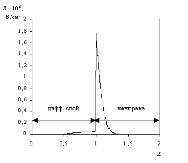Установлено, что ток Шоттки определяется только термодинамическими характеристиками мембраны и раствора, и не зависит от кинетических характеристик и размеров системы. Между двумя крайними случаями – режимом квазиравновесия и режимом Шоттки – выделен промежуточный режим. В этом переходном состоянии граничная концентрация cs с ростом тока уменьшается от концентрации В рамках модели дана оценка толщины плотной части ДЭС. Установлено, что плотная часть ДЭС – область ~ 20…100 Ả. Полученные значения напряженности электрического поля (рис. 1) в первом диффузионном слое (~5х104 В/см, при